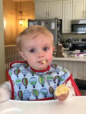 Baby LOVES yogurt these days. Seriously. He eats a whole little cup of it every morning and gets very upset if mommy isn't paying attention while I'm feeding him. ha. He'll also eat a piece of zuchini bread or some cherios to go with it. He's a champ eater! He mostly wants anything mom is eating and everything else he can get his hands on. :)